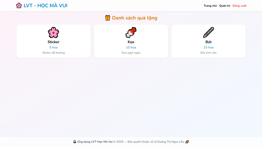 Khi tích đủ hoa, học sinh có thể đổi quà (Sticker, Kẹo, Bút…) → tạo động lực học tập và thi đua. - 📊 Bảng xếp hạng trực quan